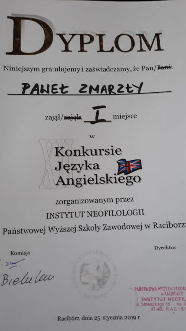 Paweł Zmarzły i Mikołaj Oleś z klasy 3a wzięli udział w Konkursie Języka Angielskiego o indeks Państwowej Wyższej Szkoły Zawodowej w Raciborzu uzyskując pierwsze i siódme miejsce odpowiednio. Obydwaj laureaci zdobyli indeksy na studia filologiczne na ww. uczelni. Gratulujemy i cieszymy się bardzo.