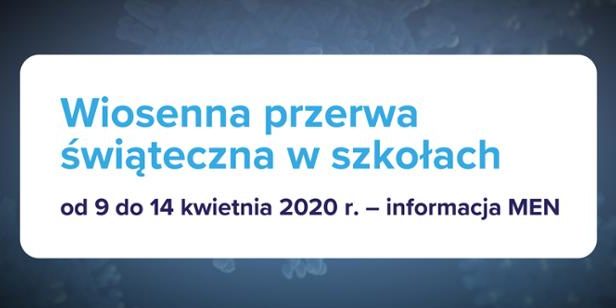 Zgodnie z informacją MEN od 9 do 14 kwietnia br. w szkole będzie trwać wiosenna przerwa świąteczna. Szkoła nie będzie prowadzić zajęć dydaktyczno-wychowawczych z uczniami w formie kształcenia na odległość.