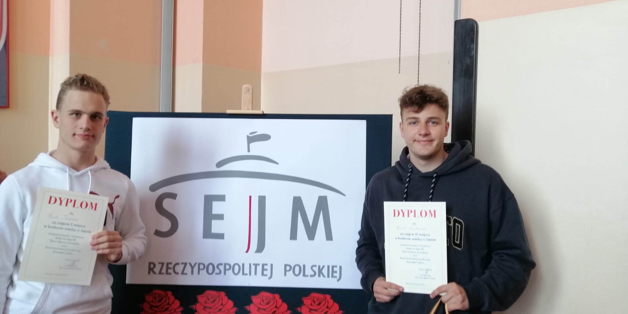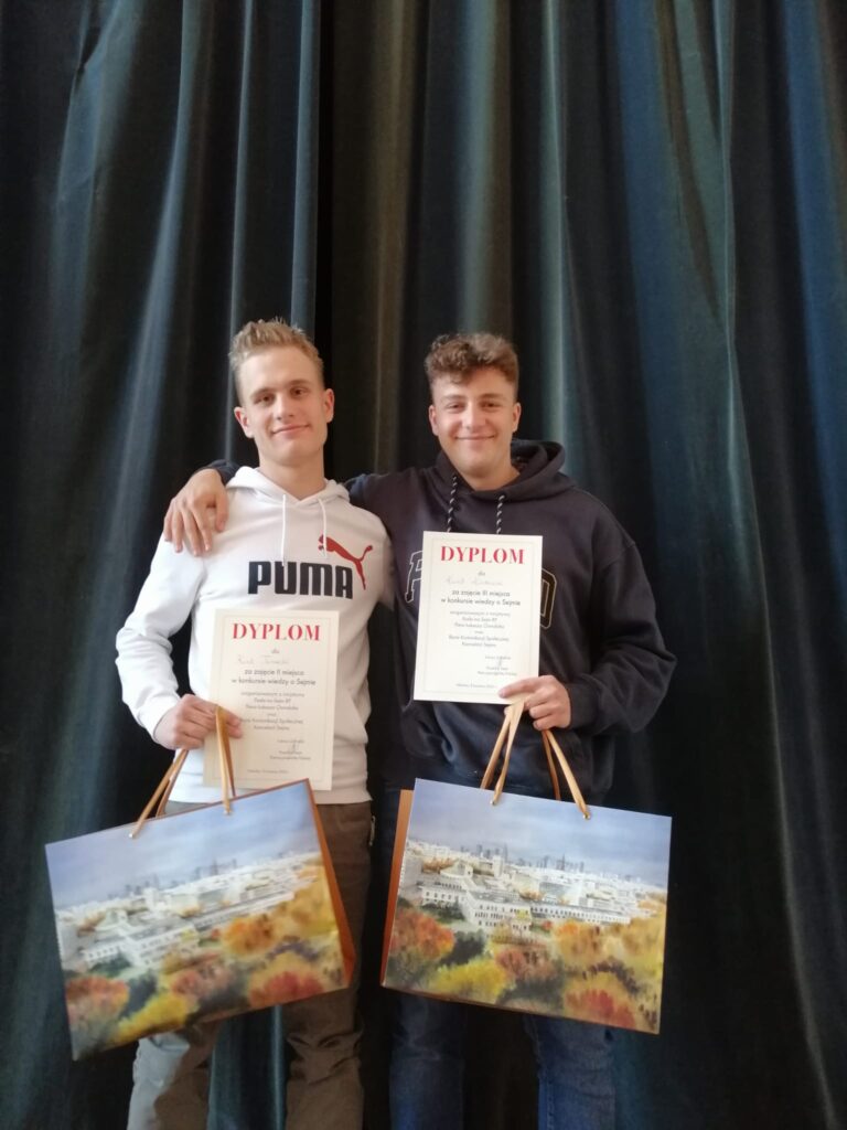 Z radością informujemy o kolejnym sukcesie naszych uczniów. Karol Tomecki i Kamil Kwiatkowski z klasy 3c wygrali Konkurs wiedzy o Sejmie RP. Karol zajął drugie miejsce, a Kamil trzecie. Konkurs był organizowany przez Biuro Komunikacji Społecznej Kancelarii Sejmu oraz z inicjatywy posła na Sejm RP Łukasza Osmalaka. Celem konkursu było poszerzenie wiedzy o współczesnym, polskim parlamentaryzmie. Serdecznie gratulujemy i życzymy dalszych sukcesów!