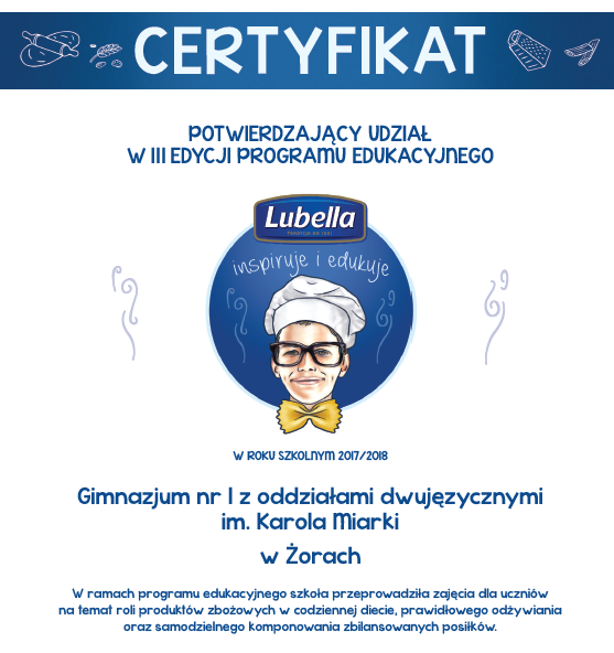 Klasa IIID gimnazjum wzięła udział w programie edukacyjnym „Lubella inspiruje i edukuje” mającym na celu wzrost świadomości znaczenia prawidłowego odżywiania w życiu człowieka. Podczas tegorocznej, III edycji uczniowie odkryli właściwości zbóż, poznali zasady prawidłowego żywienia, a także przygotowali wyjątkowe dania z wykorzystaniem produktów zbożowych. Uczniowie otrzymali Certyfikat potwierdzający udział i zaangażowanie szkoły w edukację na temat zasad prawidłowego żywienia. Brawo…