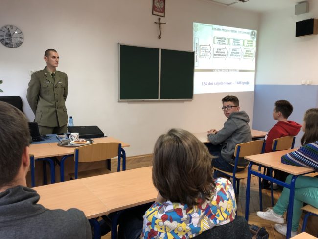 18 listopada w naszej szkole gościliśmy żołnierza zawodowego porucznika Michała Szymika z Wojskowej Komendy Uzupełnień w Rybniku. Na lekcji młodzież dowiedziała się jak wygląda rekrutacja do szkół wyższych o charakterze wojskowym, uzyskała informacje na temat kwalifikacji wojskowej, WOT i NSR. W zajęciach uczestniczyły klasy: 1AN, 1CN, 1En oraz 1B.
