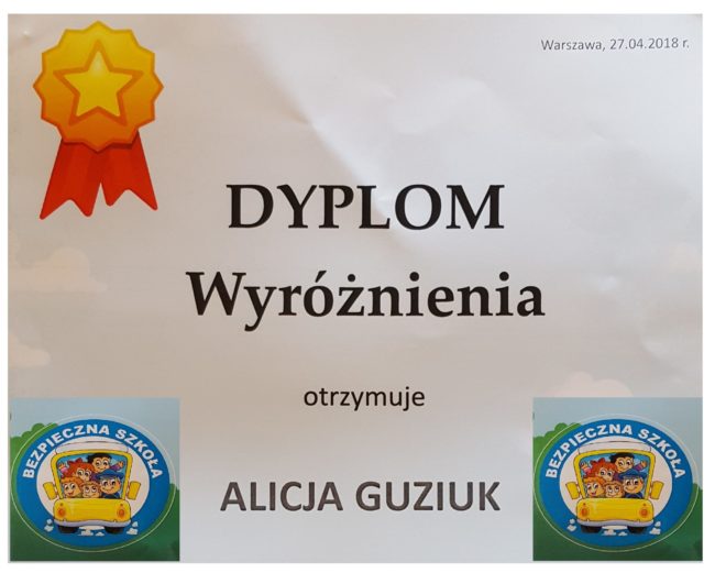 Z wielką radością informujemy, iż Alicja Guziuk z kl. IIICG została wyróżniona w V ogólnopolskim konkursie o bezpieczeństwie i zdrowym trybie życia „Bezpieczna Szkoła”. Nasze gimnazjum uplasowało się w zestawieniu ogólnopolskim na pozycji 11 z 161 szkół startujących. Miejsce szkoły w województwie – 1. Gratulujemy 😊